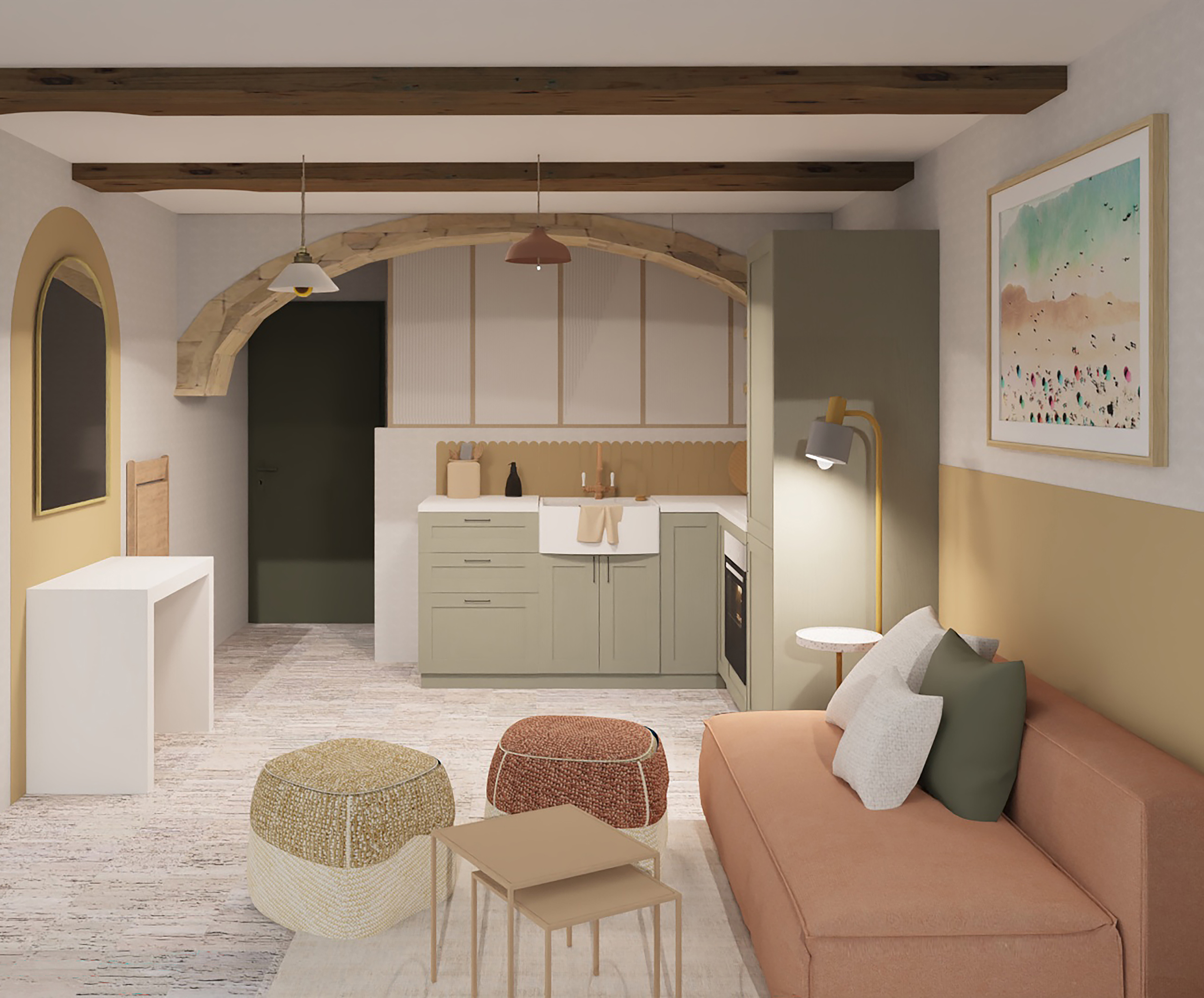 Décoration d’une pièce à vivre réalisée dans le cadre d’une visite conseil, avec choix de matériaux, palette de couleurs cohérente et solutions d’agencement ciblées pour une ambiance conviviale et fonctionnelle, dans un esprit campagne chic.